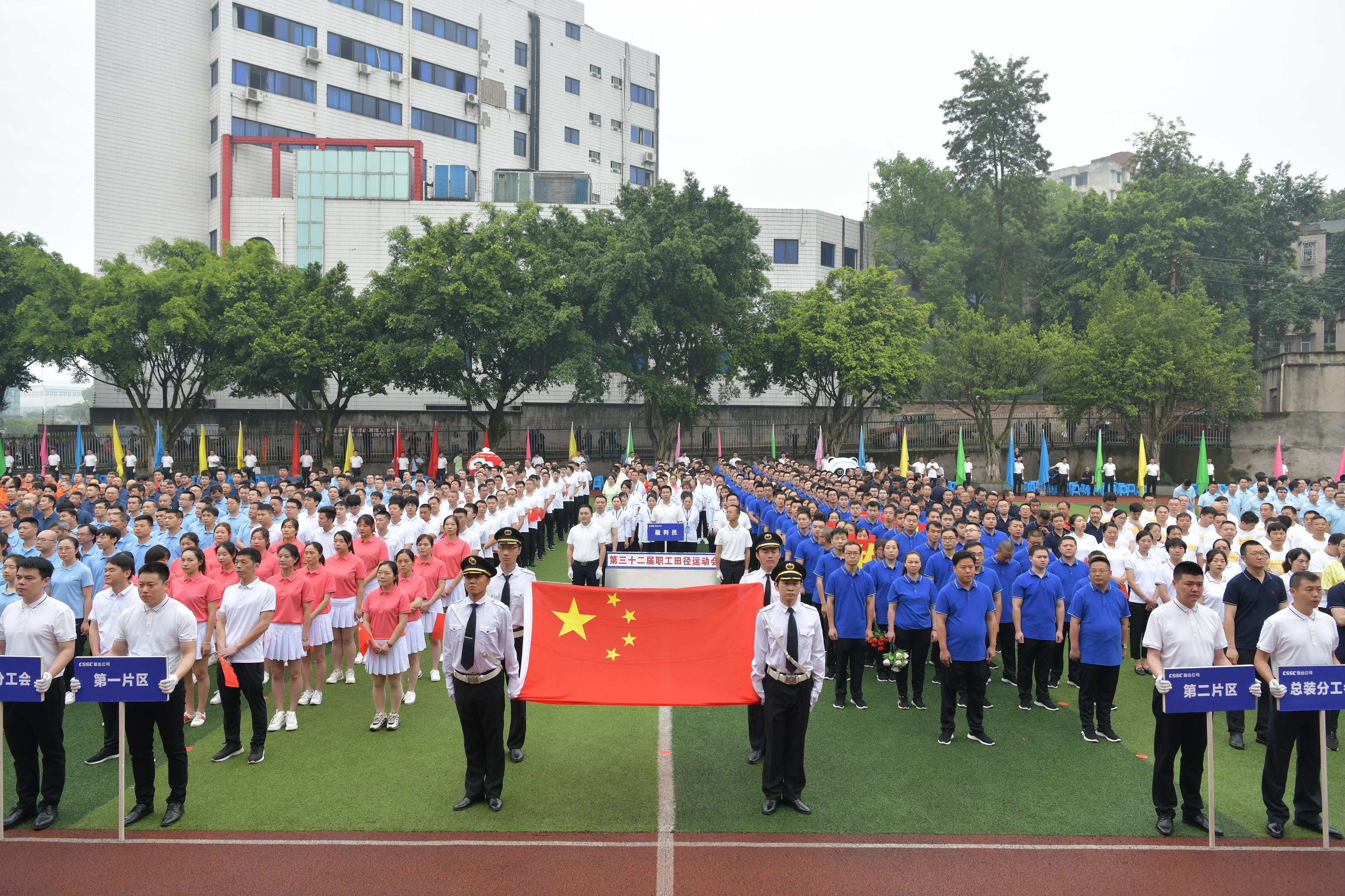 2022年5月21日,重齒公司第32屆職工田徑運(yùn)動(dòng)會(huì)正式拉開(kāi)了帷幕. 伴隨著激昂的運(yùn)動(dòng)員進(jìn)行曲,國(guó)旗隊(duì)、彩旗隊(duì)、裁判員隊(duì)以及各分工會(huì)著裝整齊,精神飽滿,依次有序的通過(guò)主席臺(tái),接受檢閱。鮮艷的五星紅旗冉冉升起,全體干部職工在雄壯嘹亮的國(guó)歌聲中舉行了莊嚴(yán)的升國(guó)旗儀式。