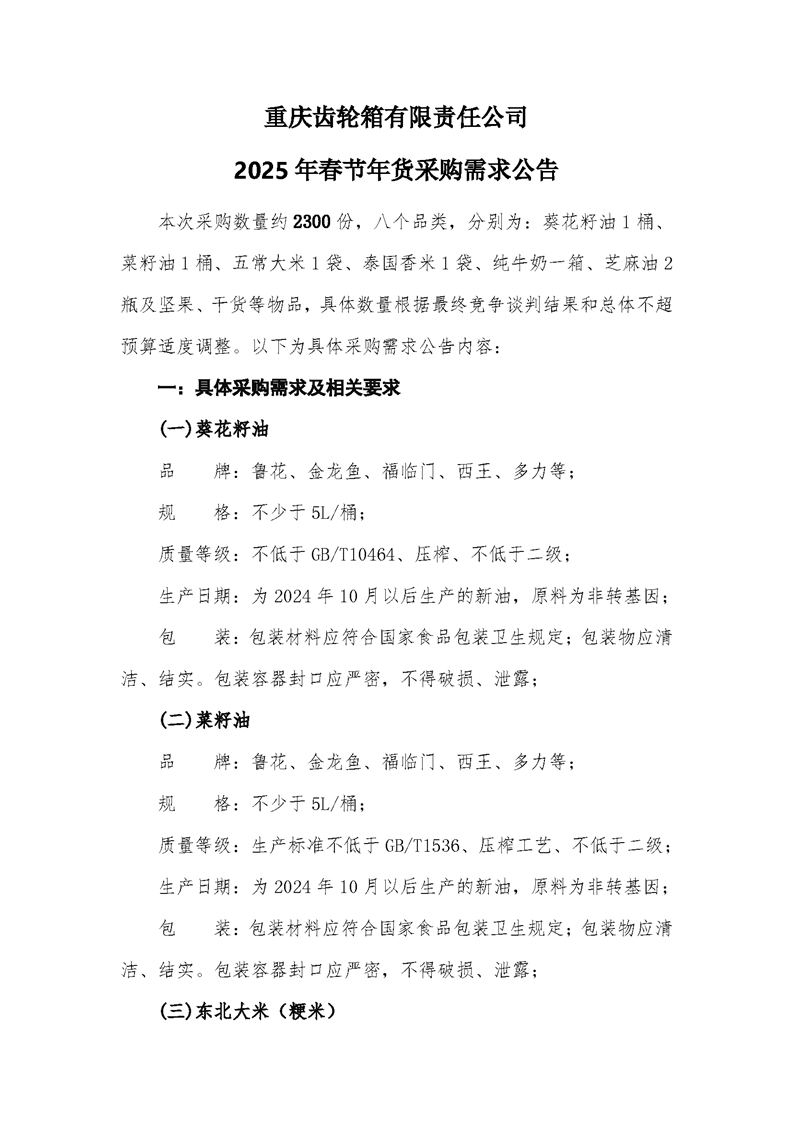 重慶齒輪箱有限責(zé)任公司2025年春節(jié)年貨采購(gòu)需求公告