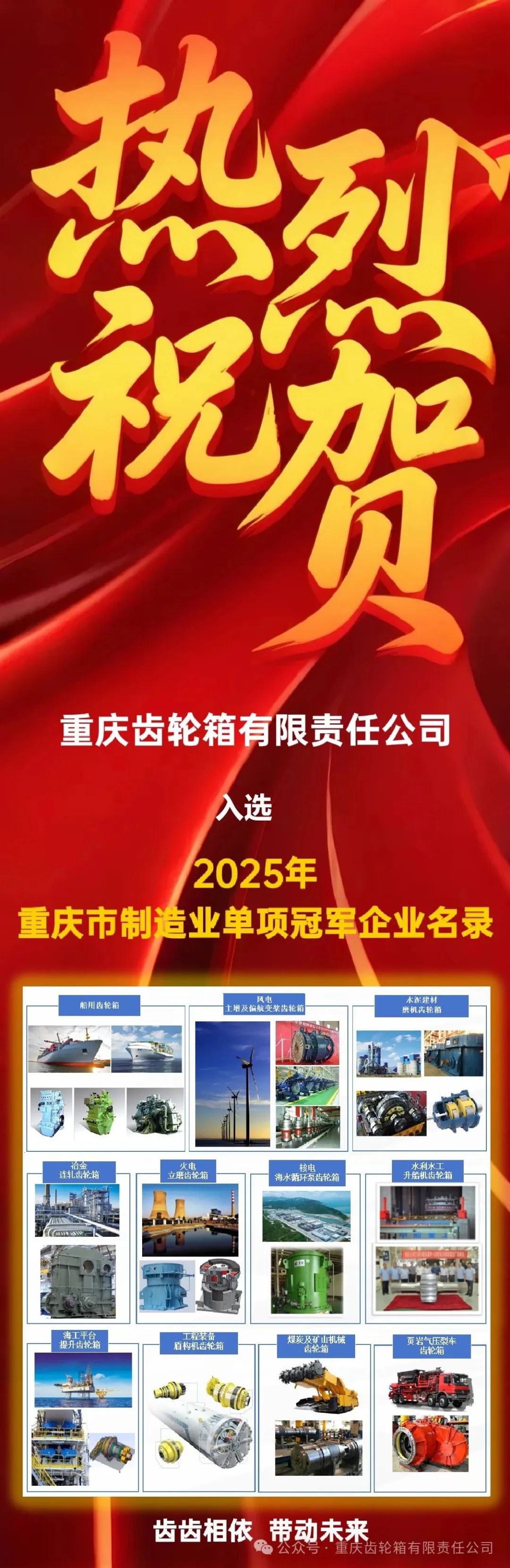 近日,重慶市經(jīng)濟(jì)信息委公布了2025年度重慶市制造業(yè)單項(xiàng)冠軍企業(yè)名錄,共30家企業(yè)入選,重慶齒輪箱有限責(zé)任公司作為一家有著近60年研發(fā)和制造高、低速重載齒輪箱為主的大型專(zhuān)業(yè)化企業(yè),名列其中!